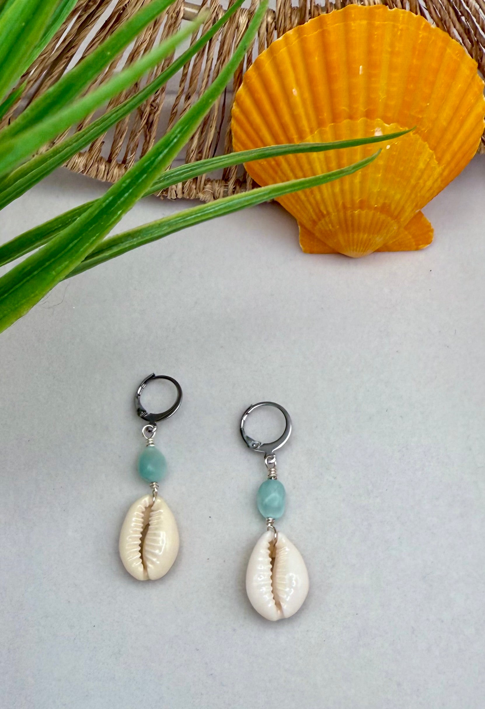 Green Moonstone and Cowrie Shell Dangle Earrings