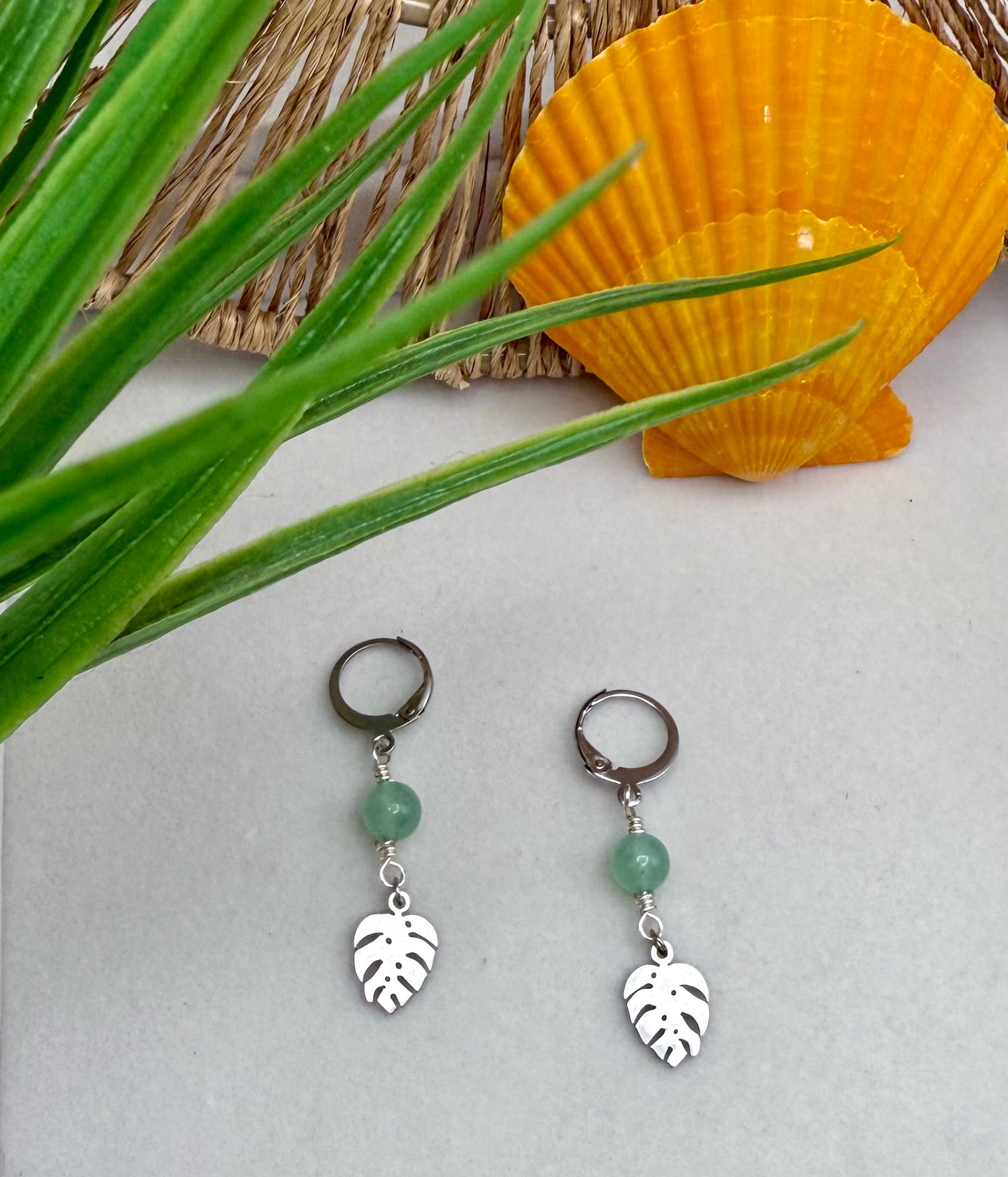Sea Foam Green Beaded Monstera Leaf Earrings